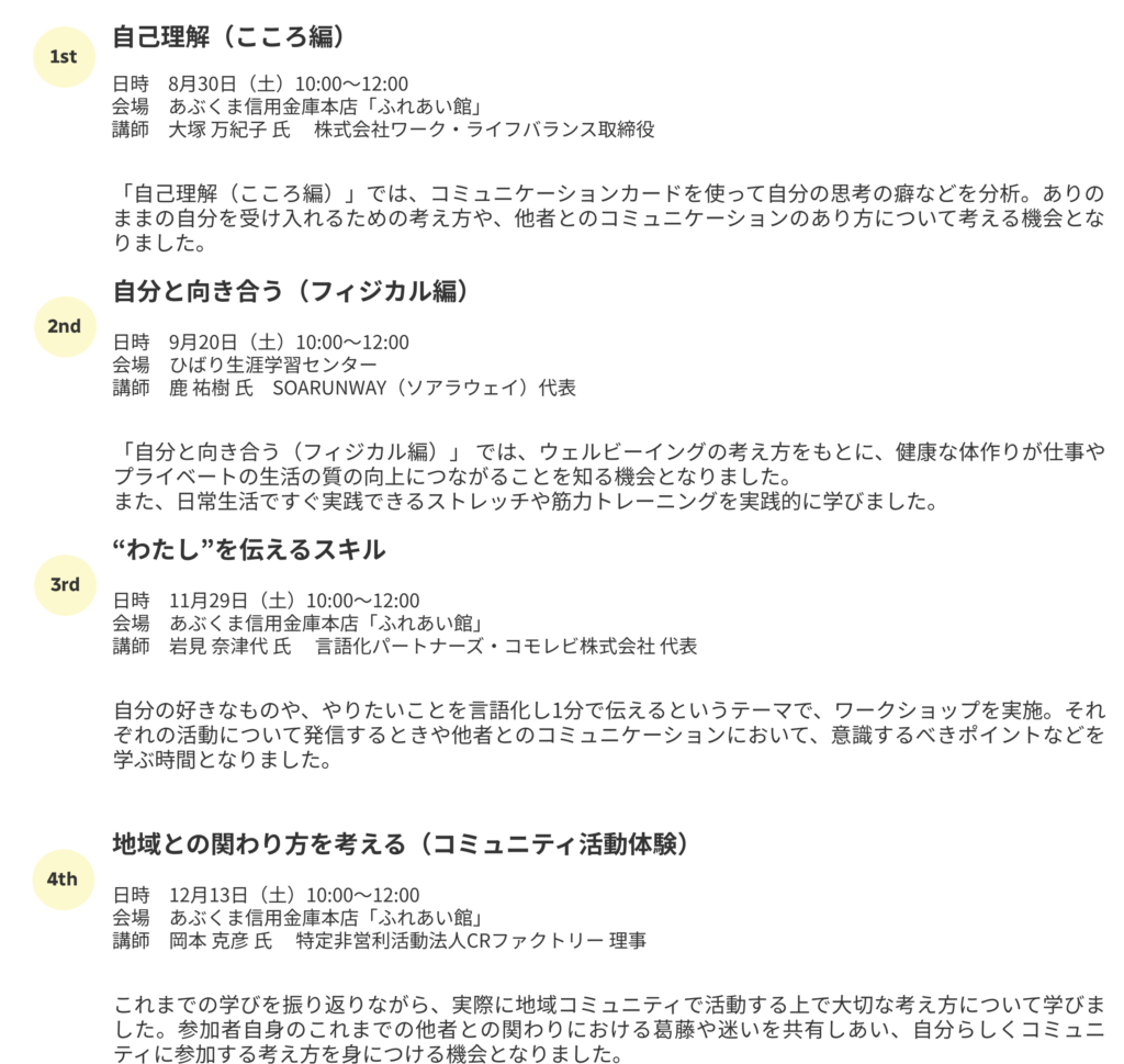 本ワークショップは、自己理解を深めるワークや自分の考えを言語化する講座をはじめ、市内で活躍している方のお話を聞く座談会、「地域コミュニティ」をテーマに考えるまとめのワークショップなどで構成しています。